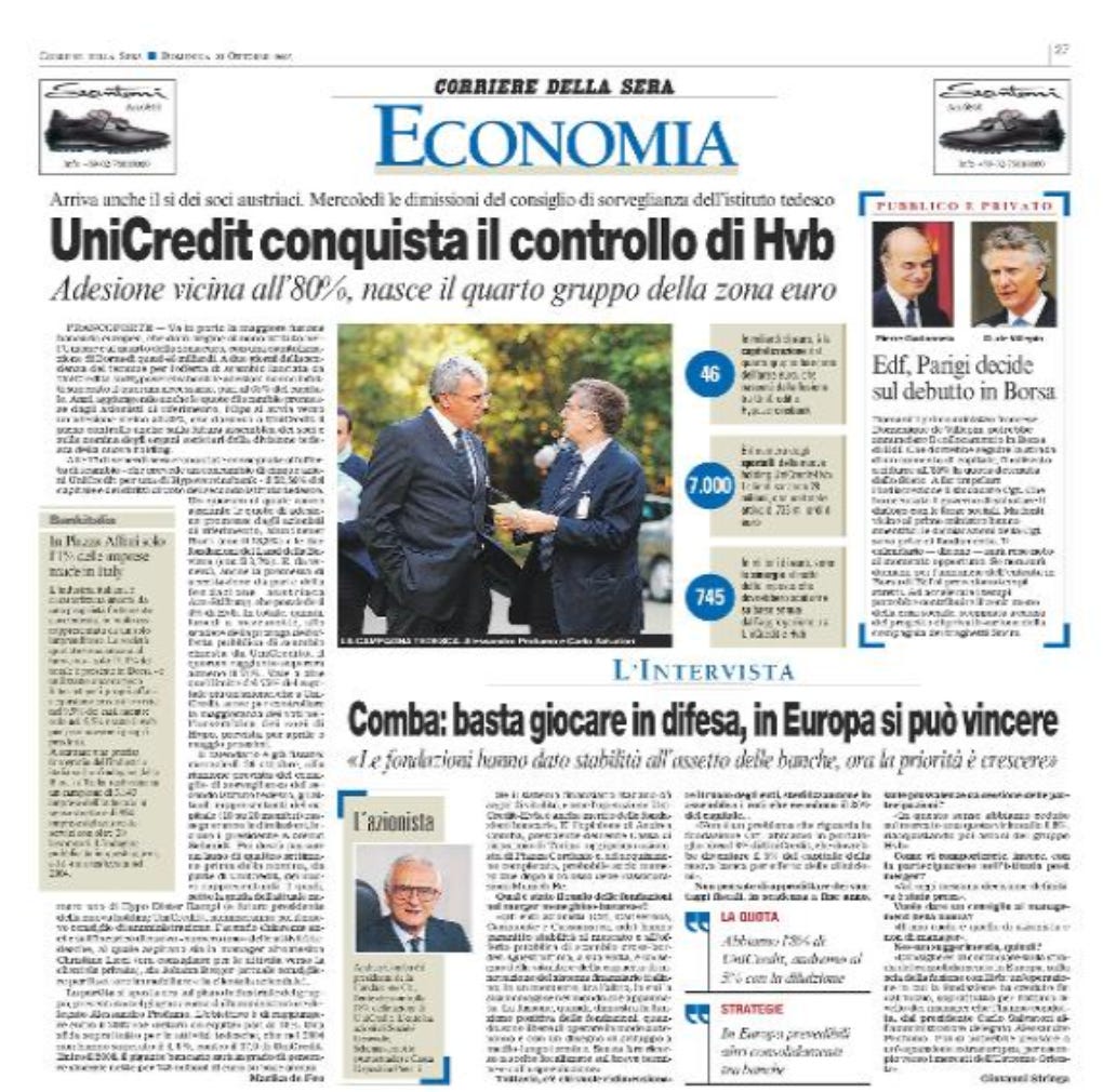 E non è un’esagerazione. Nel 2005, quando UniCredit lanciò l’offerta su HVB - la seconda banca tedesca per capitalizzazione - i giornali italiani ne parlarono per settimane. Il Sole 24 Ore gli dedicò l’apertura e pagine su pagine di analisi, il Corriere fece titoloni sulla “conquista” italiana della banca bavarese. Era la nascita del primo vero gruppo bancario europeo, una cosa mai vista, un’azienda italiana che comprava una delle banche più importanti di Germania. Fu una notizia enorme.