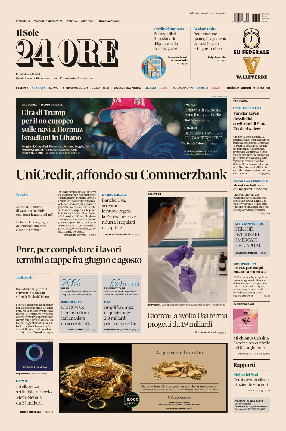 Il 17 marzo Il Sole 24 Ore ci ha aperto. Ma doveva dividersi la prima pagina con “L’ira di Trump per il no europeo sulle navi a Hormuz”.